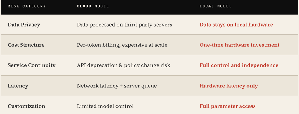 The Core Method is a philosophy and methodology designed precisely to close this gap. Its core argument is simple: if an AI system can run on the user's local hardware, it achieves structural advantages over cloud alternatives across privacy, cost, and sovereignty dimensions.