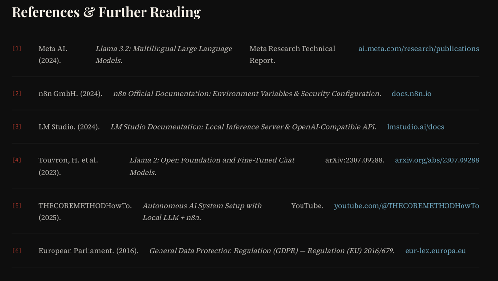 Meta's Llama 3.2 (3B parameter) model is loaded onto local hardware via the LM Studio interface. LM Studio exposes the model as an OpenAI-compatible REST API, enabling existing n8n integrations to be redirected to the local server without any code changes.