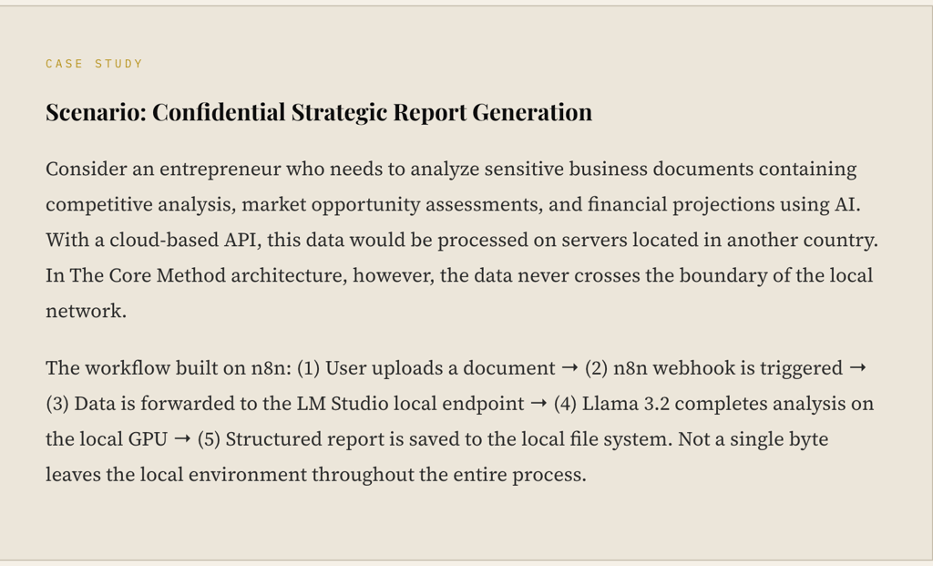 This section examines a real-world application of The Core Method architecture in case study format. The application covers a fully autonomous analysis pipeline in which sensitive business data is processed on a local GPU without requiring an internet connection to generate strategic reports.