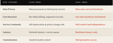 Since 2023, cloud-based large language models (LLMs) offered by companies such as OpenAI, Anthropic, and Google have rapidly proliferated across enterprise and individual use cases. However, this proliferation has introduced serious structural concerns: user data is transmitted to third-party servers, prompt-based information may be incorporated into model training, and service continuity guarantees remain subject to pricing policy changes.