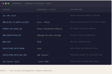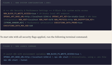 The critical component of system security is n8n's environment variable configuration. In particular, the N8N_BLOCK_FS_WRITE_ACCESS parameter restricts the n8n process's write permissions to the file system at the hardware level.