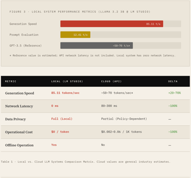 Experimental measurements were conducted on Apple Silicon consumer-grade hardware. The data below was obtained through LM Studio's built-in statistics panel and is analyzed in the context of comparable cloud-based inference services.